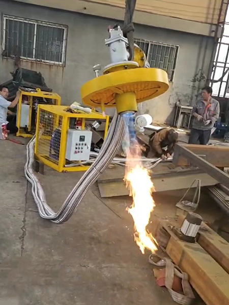 用于對新砌包干燥,周轉包進行快速或慢速烘烤,使用天然氣時加熱溫度1100土50C左右,最大升溫速度40C/min,鋼包(中間包)內最大溫差約30C.冷態包離線烘烤約2.5小時,包襯溫度可達到1000C以上。 使用天然氣對在線鋼包(中間包)快速烘烤時,可加熱至1100C以上,升溫速度≥40C/min,鋼包(中間包)內最大溫差約30C。通常烘烤10-20 min包襯即可達到目標溫度。 |